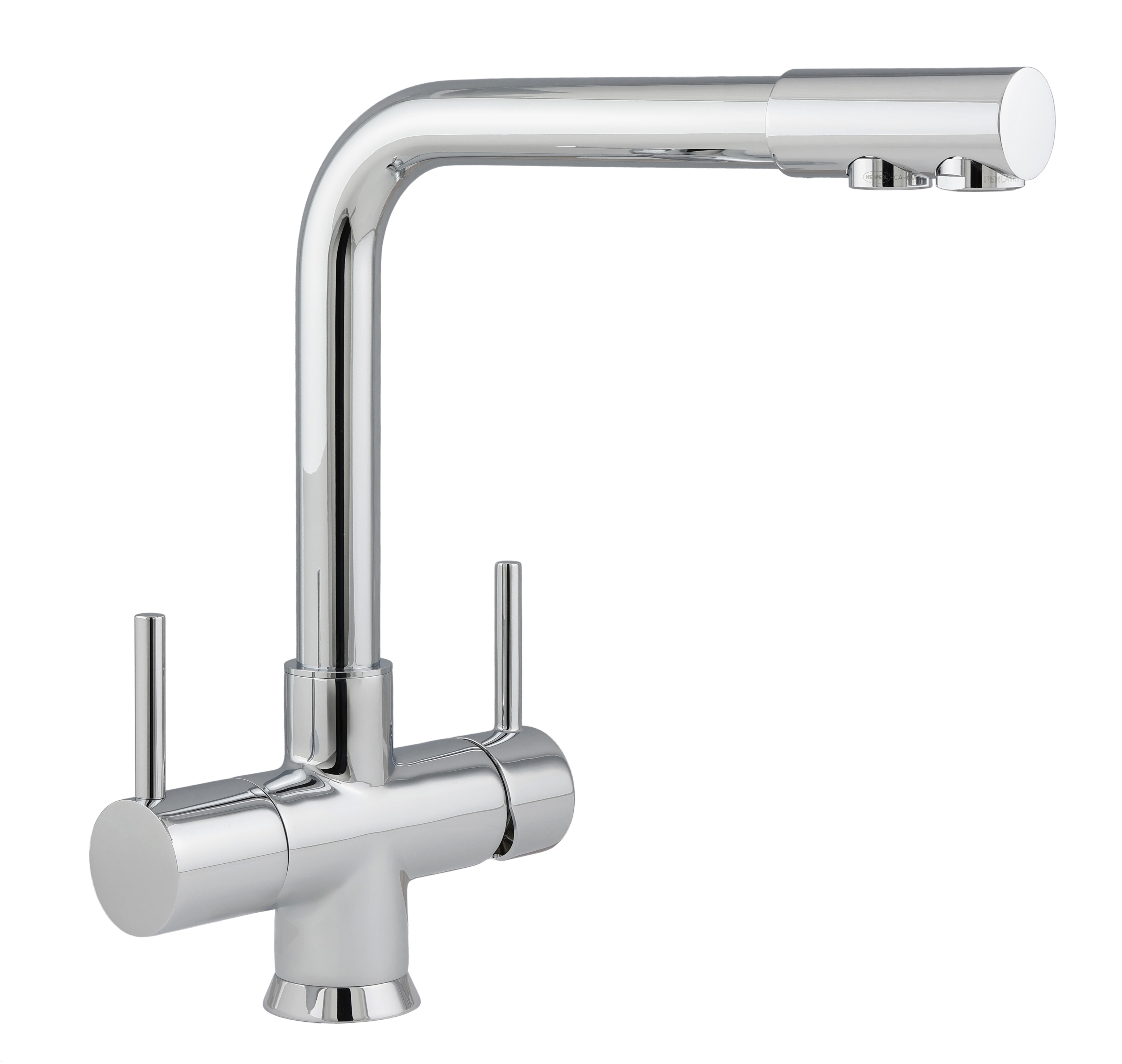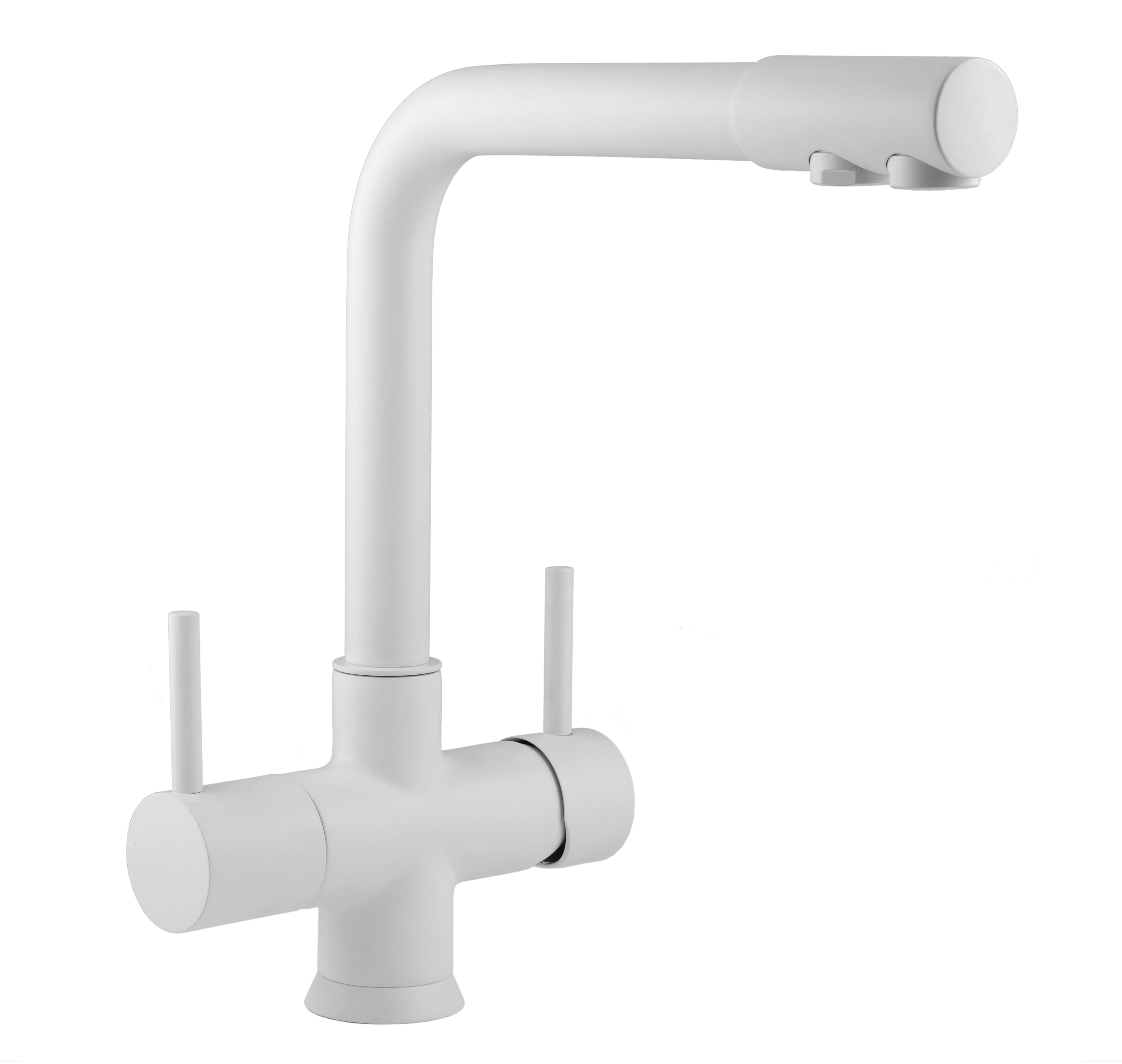 Miscelatore a tre vie con uscita delle acque separata. Maniglia acqua depurata con pomolo.