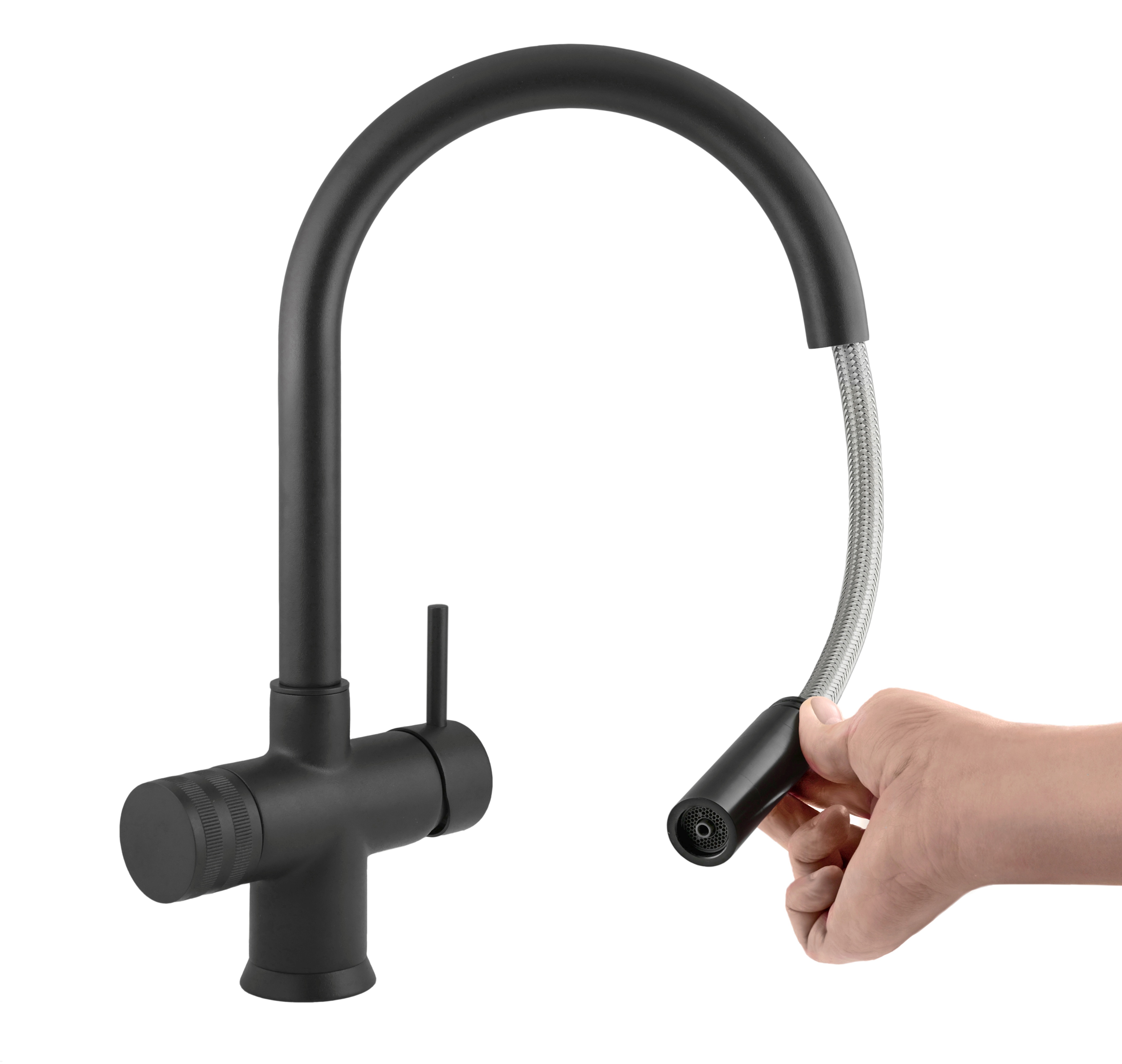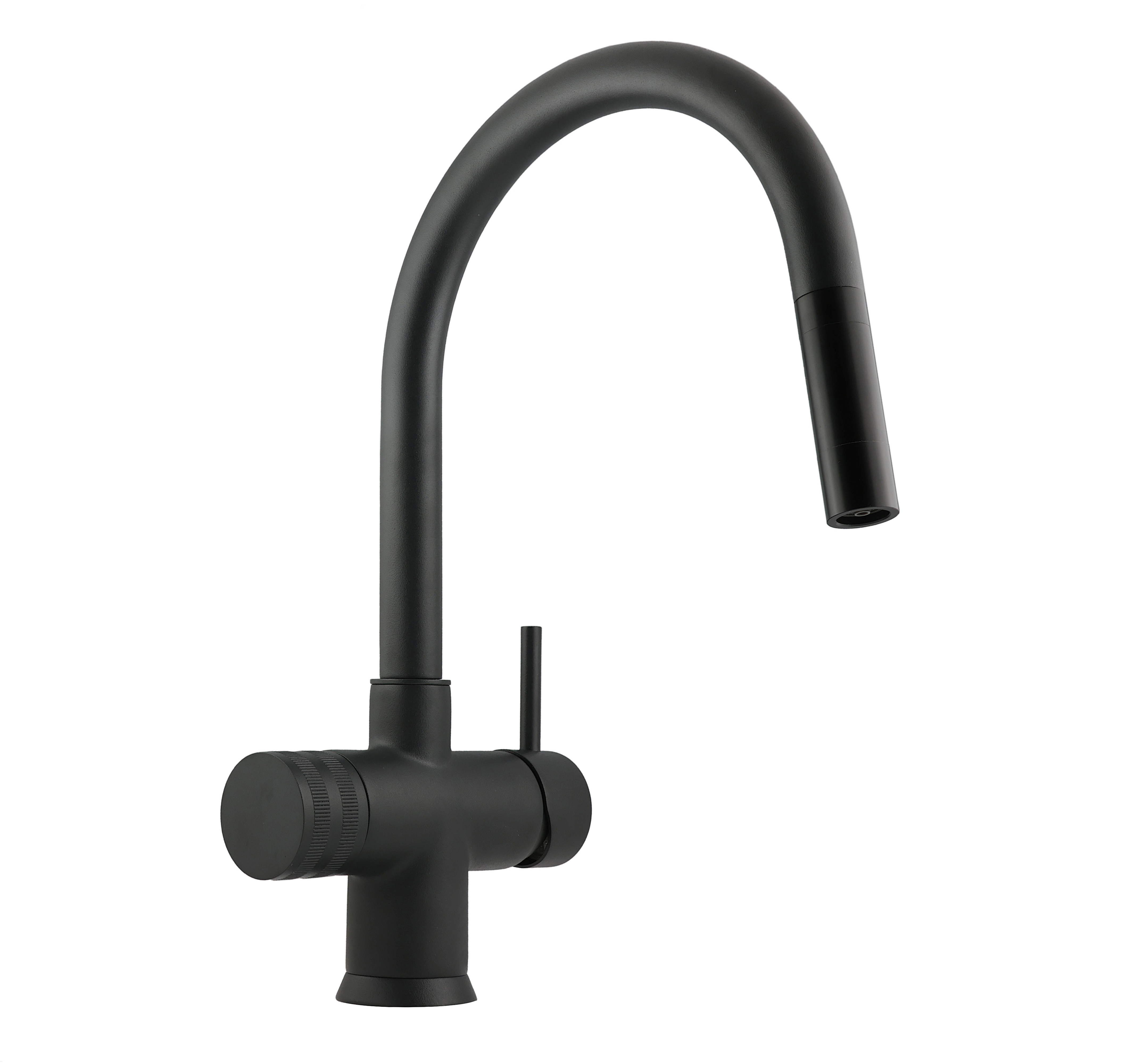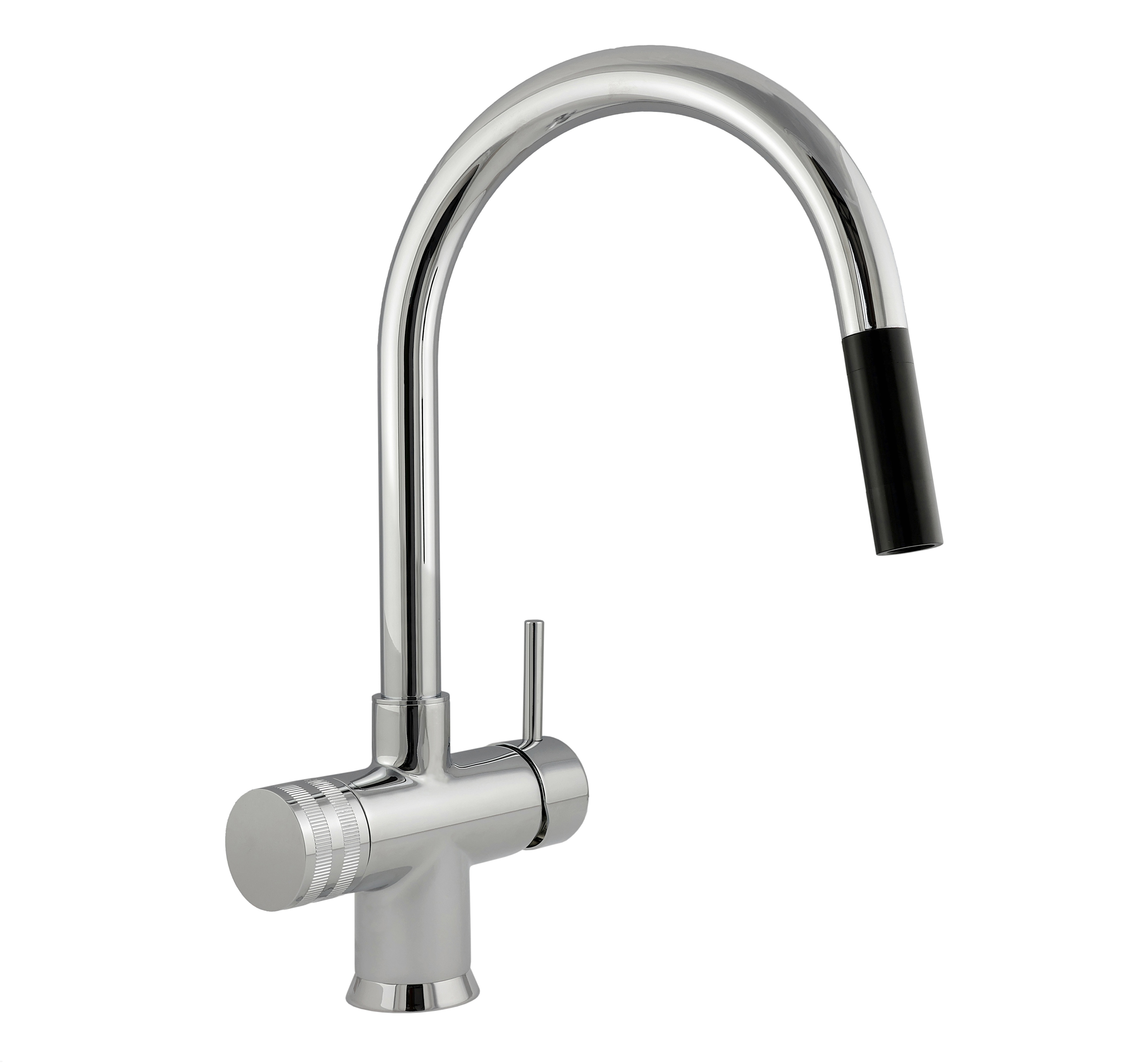 Miscelatore a tre vie meccanico con doccetta estraibile e canna bow.